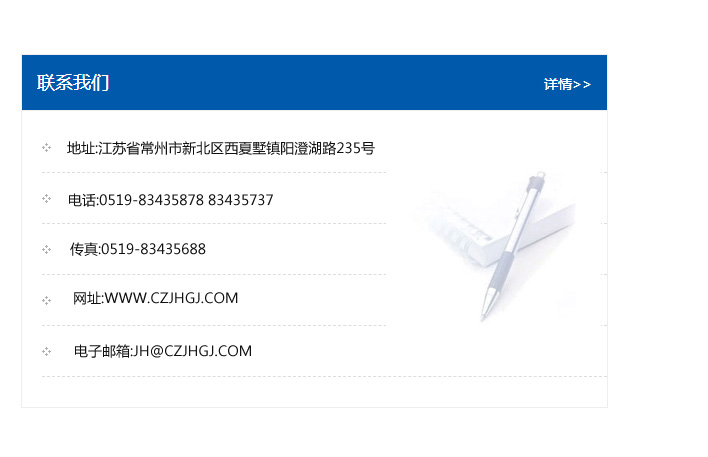 地址:常州市新北區友邦商務大廈1幢16、17層  電話:0519-85101652  傳真:0519-85112595  郵編:213022  網址:www.cz-jiayue_cn.13858860623.com  郵箱:xiajifengaa@163.com